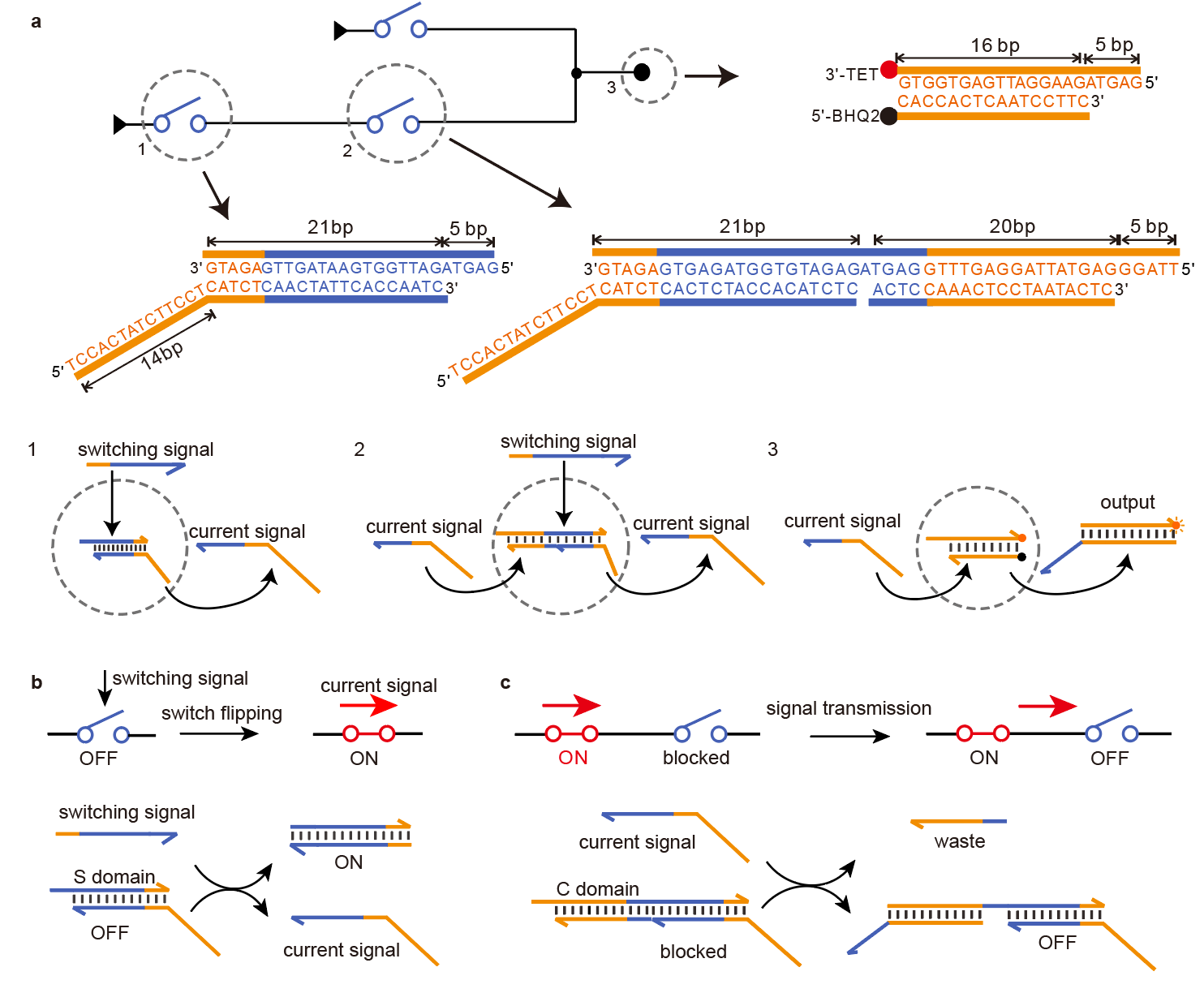 DNA计算旨在利用DNA分子反应来实现数字运算功能,是生物计算领域的重要组成部分。特别的,DNA链置换反应为构建常温下运行的复杂数字电路给予了重要工具。DNA链置换反应是利用DNA分子杂交的自由能差异,以一条单链序列将另一条单链从杂交DNA双螺旋结构中取代下来用于后续反应,具有精确的序列正交性。然而,迄今为止的DNA数字运算电路均基于逻辑门来实现,电路较为复杂,而随着参与反应的DNA链数目增加,其运算速度和信噪比均受到限制。而开关电路则是由信息论创始人香农(Claude Elwood Shannon)在在电子电路开展的早期阶段就提出来的一种方法,可以高效、经济地实现任意数字功能,是构成现代通讯的基础。受此启发,樊春海团队提出了一种模块化的DNA分子开关,顺利获得构建DNA开关电路在实验上实现了任意功能的数字运算。