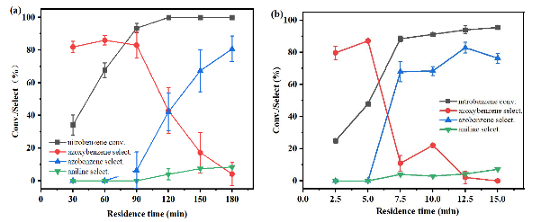 图2 (a)釜式反应器,(b)气液固段塞流下的硝基苯光催化反应性能对比