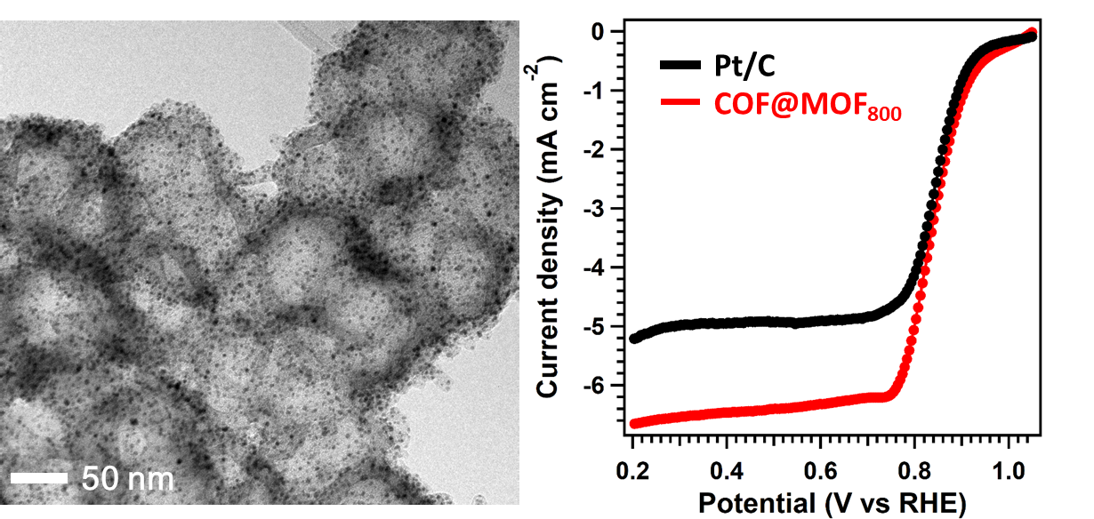 共价有机框架材料(COFs)是一类具有结晶性的有机多孔材料,具有结晶性好和比面积大等性质。经过热处理,COFs材料可转换成杂原子均匀参杂的多孔碳材料,是理想的电容器、锂硫电池电极、锂离子电池电极和电化学催化材料。然而直接碳化的COFs材料存在比表面积低,孔道结构容易塌陷的问题。电催化氧还原(ORR)是空气电池以及燃料电池组件中的重要半反应。性能最好的商用Pt/C催化剂的缺点是高成本以及较弱的稳定性。降低催化剂中的铂含量以及增加其稳定性具有十分重要的意义。
