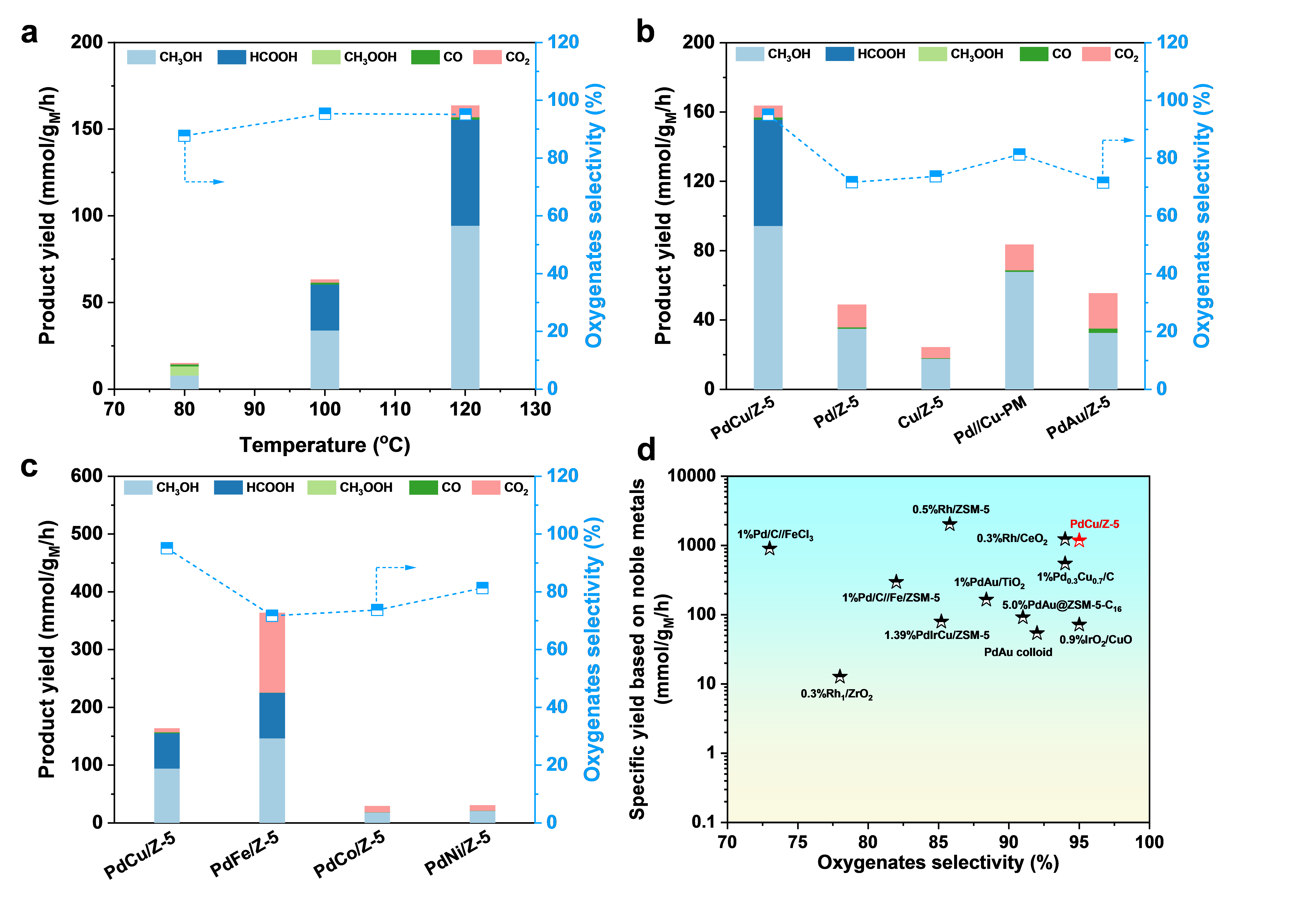 近期,中科院上海高等研究院低碳转化科学与工程重点实验室钟良枢研究员、孙予罕研究员团队在国际顶级期刊Angew. Chem. Int. Ed.上发表了题为“Tandem Catalysis for Selective Oxidation of Methane to Oxygenates Using Oxygen over PdCu/Zeolite”的研究论文(Angew. Chem. Int. Ed., 2022, DOI: http://doi.org/10.1002/anie.202204116)。该研究构建了一种ZSM-5(Z-5)负载的PdO纳米颗粒和Cu单原子共存的双组分体系(PdCu/Z-5),实现了以分子氧(O2)为氧化剂,在H2存在条件下串联催化甲烷(CH4)转化为含氧产物,在120 °C下取得了高达1178 mmol/gPd/h的含氧产物收率和95%的含氧产物选择性。顺利获得串联催化途径,在PdCu/Z-5催化剂上实现了以O2为氧化剂CH4高效转化制备含氧产物,并结合控制实验和机理研究阐明了Pd和Cu物种在反应过程中起的作用。