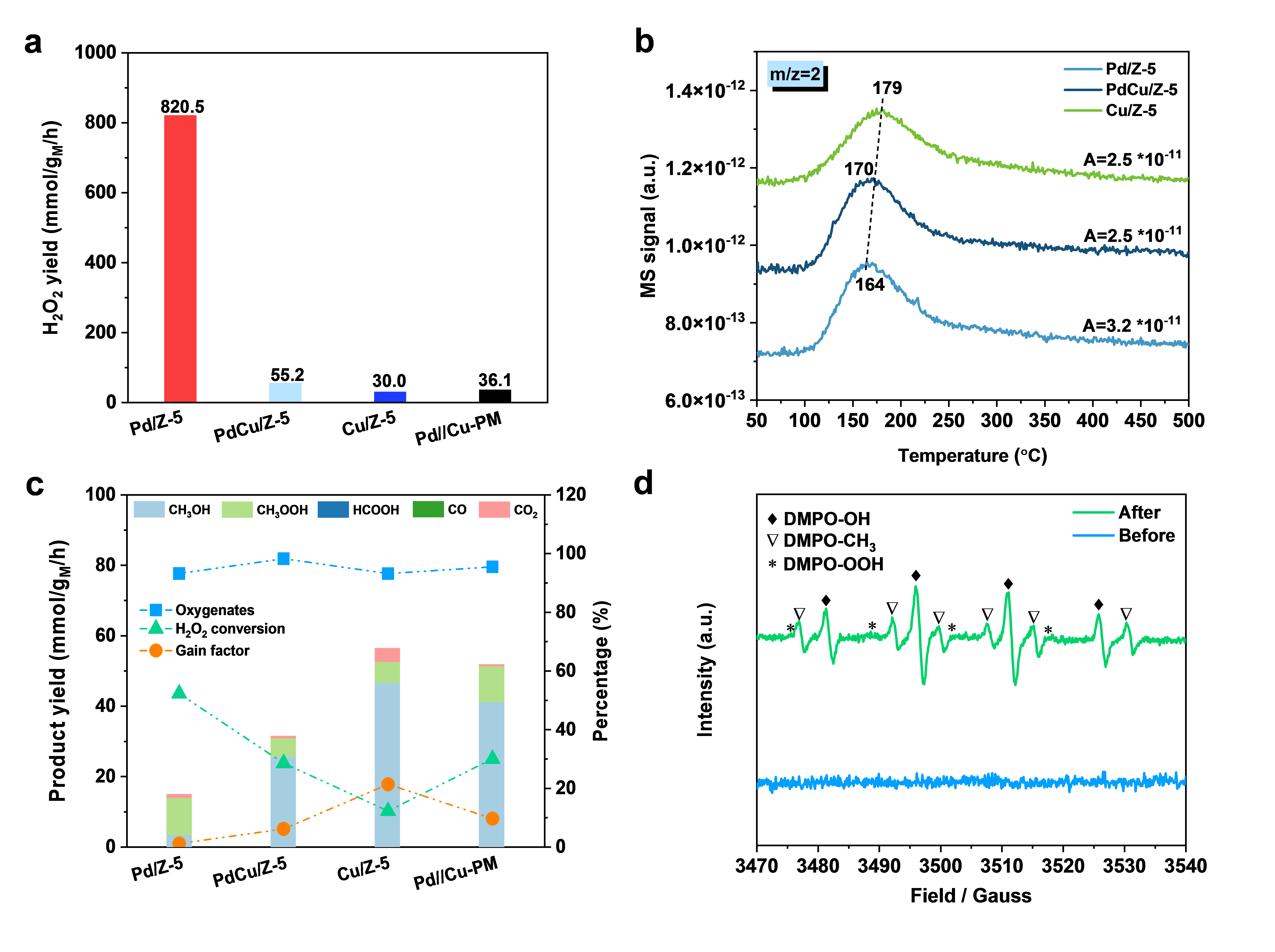 控制实验和机理研究表明PdO纳米颗粒可促进原位合成H2O2,而Cu单原子可以高选择性地将原位生成的H2O2转变为·OH,进而进攻CH4转变为·CH3,最终·OH捕获·CH3形成 CH3OH。顺利获得串联催化途径,在PdCu/Z-5催化剂上实现了以O2为氧化剂CH4高效转化制备含氧产物(图2)。