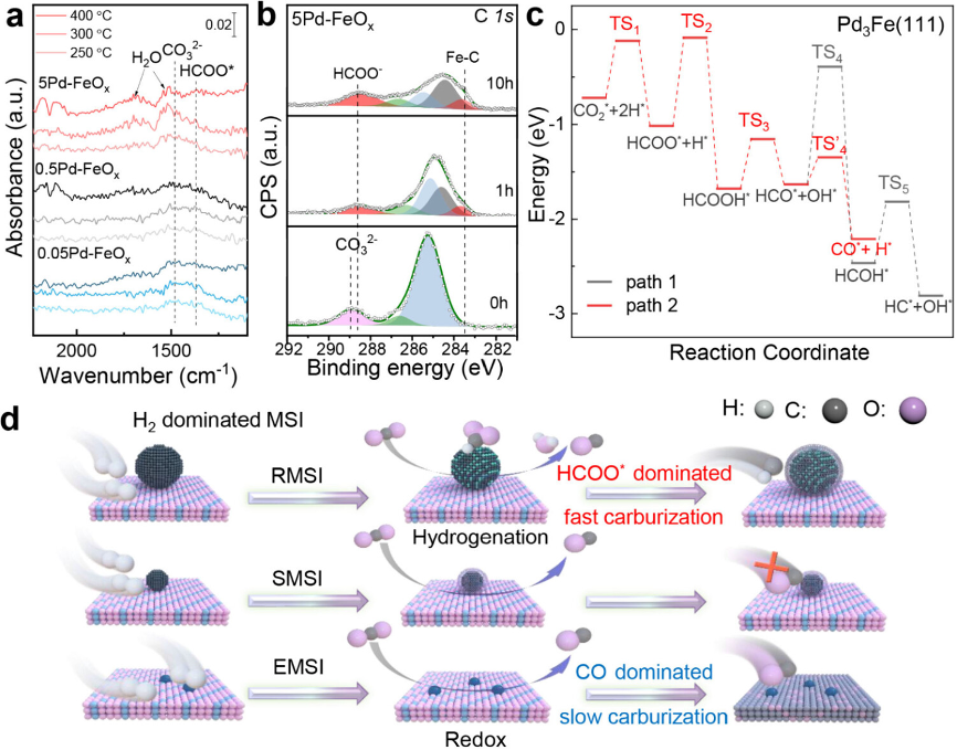 研究组制备了三种尺寸的催化剂(5Pd-FeOx、0.5Pd-FeOx、0.05Pd-FeOx),发现大尺寸 5Pd-FeOx诱导活性金属-载体相互作用,在原位形成 Pd3Fe导致反应路线改变,可快速表面渗碳,最后取得优异的催化性能。顺利获得一系列最先进的表征,包括准原位XPS,AC-STEM, DRIFT,确定了原位合金化而不是表观尺寸差异对于活性Fe5C2相的形成至关重要。DFT计算阐明了不同催化剂的作用机理和不同MSI导致的动态重构。建立了三种不同的催化模型(Pd3Fe(111)、FeO/Pd(111)和Pd1Fe2O3(0001))分别代表5Pd-FeOx、0.5Pd-FeOx和0.05Pd-FeOx催化剂。Pd3Fe(111)催化剂在氢化过程中CO*和CH*的能垒较低,有利于中间体的形成和进一步的快速渗碳。相比之下,0.05Pd-FeOx催化剂缺乏CHx,需要缓慢还原渗碳才能取得大量的Fe5C2结构。作为概念验证,我们进一步在 FeOx 上设计了一种预合成的 Pd3Fe 合金,并顺利获得受控的快速渗碳发现了增强的活性和降低的 Pd 负载。这项工作不仅证明了动态渗碳的可控性,而且顺利获得对原位催化剂变化的全面理解,提出了优化催化剂的基准。