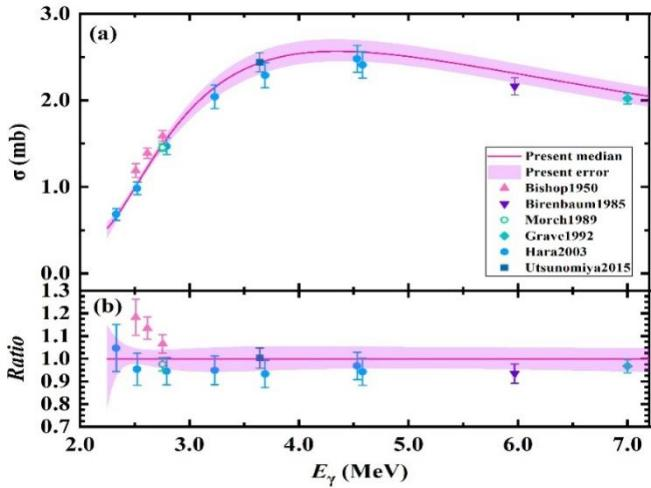 图3:D(g, n)p反应的光中子截面。(a)基于SLEGS装置的结果以红线表示,不确定度以彩色带子表示。为便于比较,还展示了之前的数据;(b)本实验结果与之前的比较(以本实验结果作为参考)。