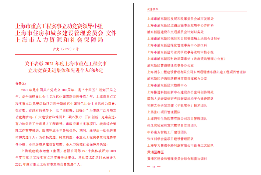 为弘扬先进、树立典型,上海市重点工程实事立功竞赛领导小组、市住房城乡建设管理委、市人力资源社会保障局组织遴选优秀项目团队和先进集体。1月24日,市委副书记、市长龚正出席2021年度上海市重点工程实事立功竞赛表彰大会并讲话。